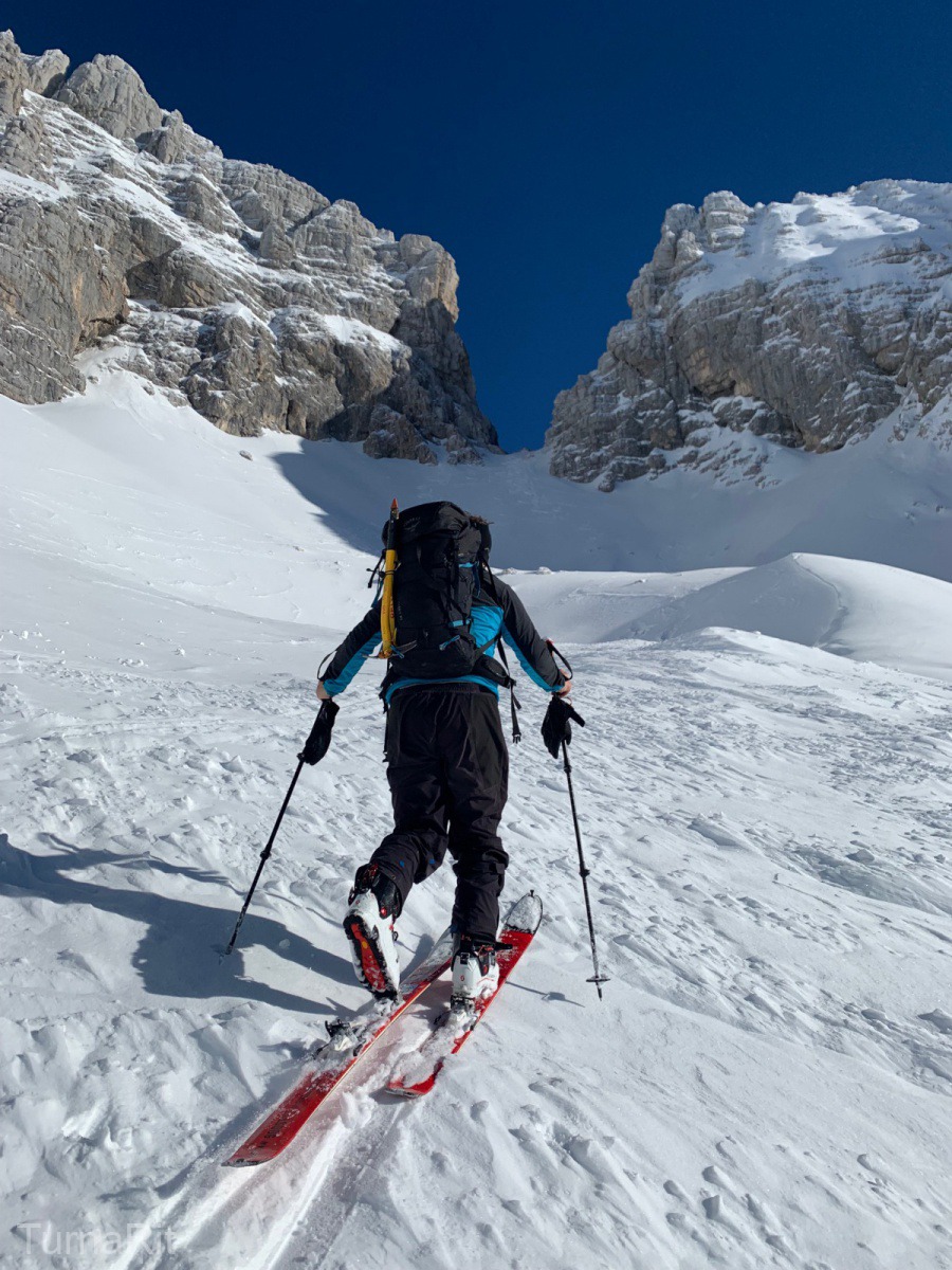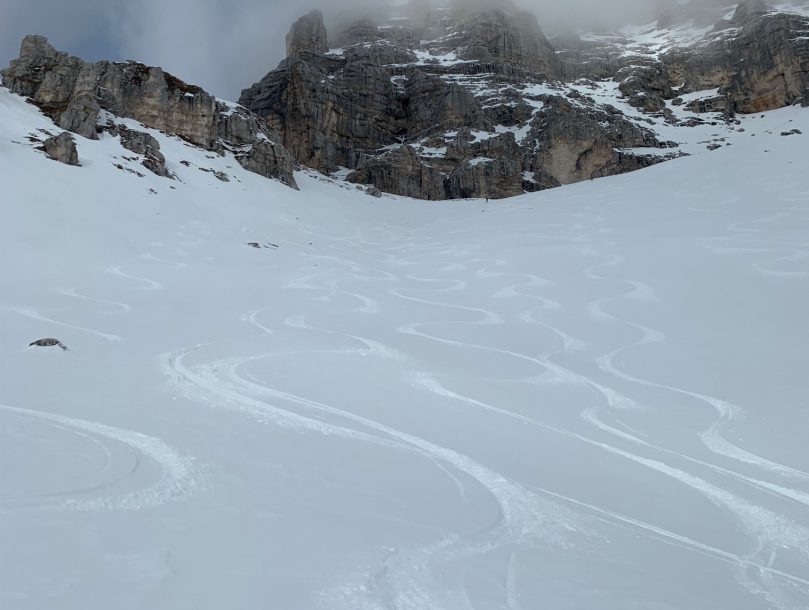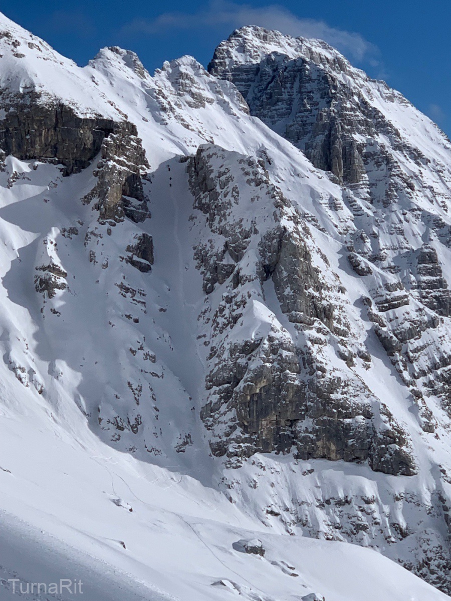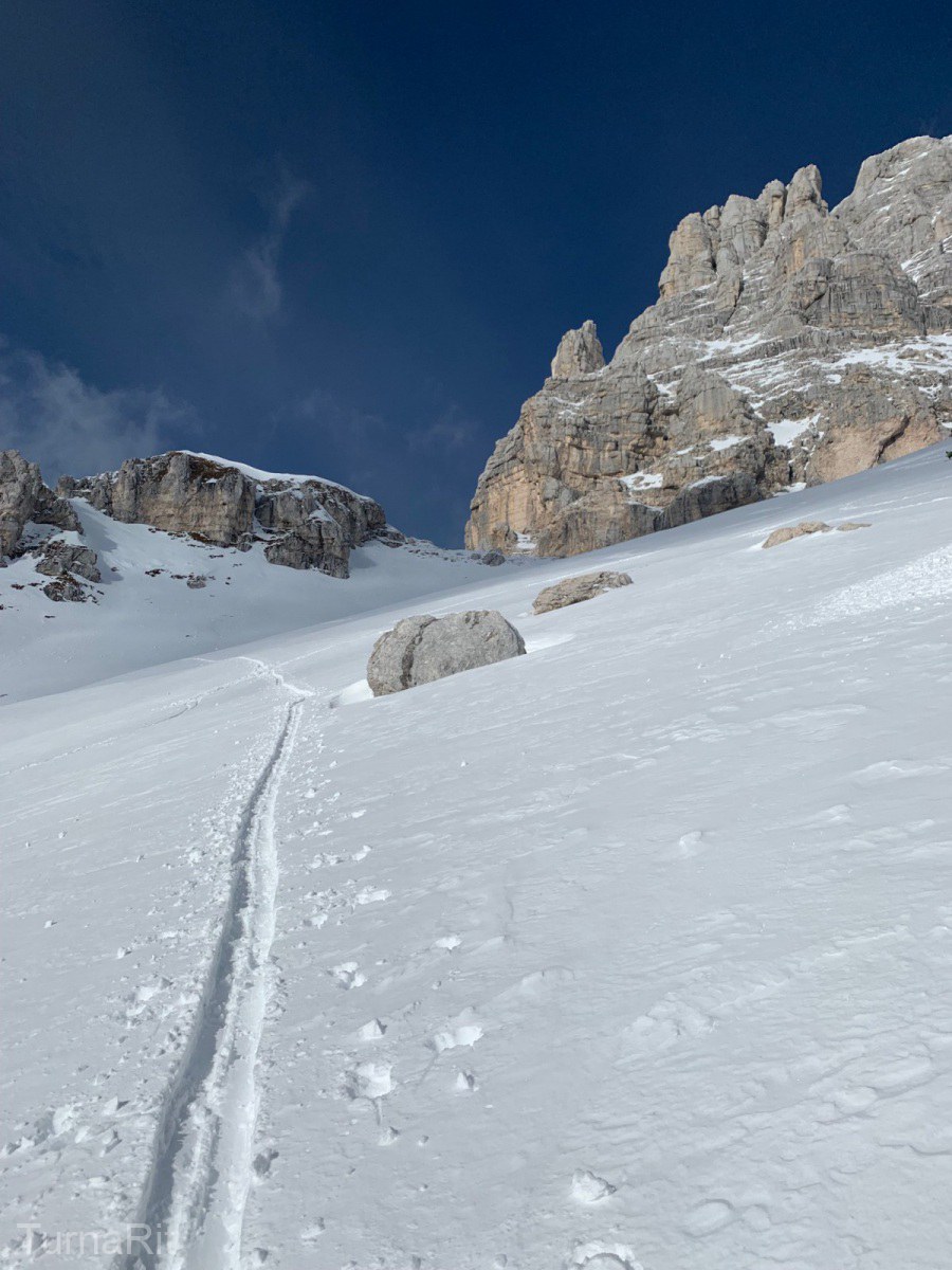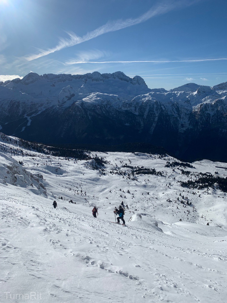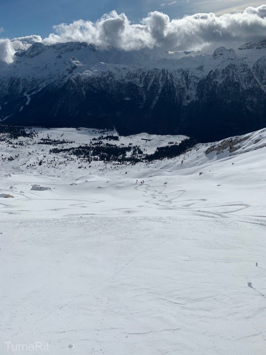 V soboto smo izkoristili maksimalno lep dan s spomladanskimi temperaturami, brez vetra. Radovednost nas je zapeljala do Pecola. S parkinga pri hotelih Selle Nevee smo nesli smuči približno pol ceste do planine, kamor so se nekatere fiat pande italianske bande tudi zapeljale. Kljub zgodnji uri je na Pecolu hitro vse obsijano, plazovi preteklih dni so bili že fajn predelani. Zapodili smo se na dve klasiki- najprej proti redki senci Škrbine nad Cijanerico (Forca del Palone 2242m), kjer je špuro prejšnjih dni dodobra zapihalo in smo jo zdrli malo po svoje. Po levi smo odsmučali nekaj pršiča, nato pa zavili desno po avtocesti še na sedlo Vrh Strmali – škrbina pod Montažem (Forca dei Disteis 2201m) , kjer se je ravno zoblačilo. Smuka po flanki je bila glih prav zmehčana od sonca, nižje pa je že začelo vlačiti repe. Še nižje je minsko polje, ki ga v parih dneh, sodeč po vremenski napovedi, ne bo več.
