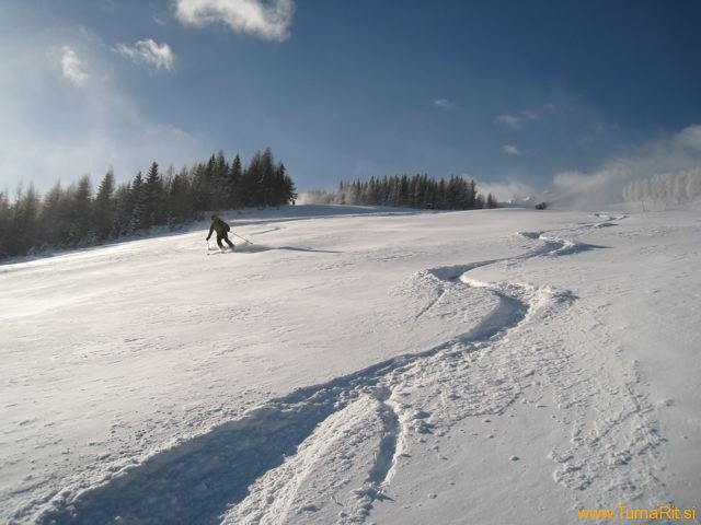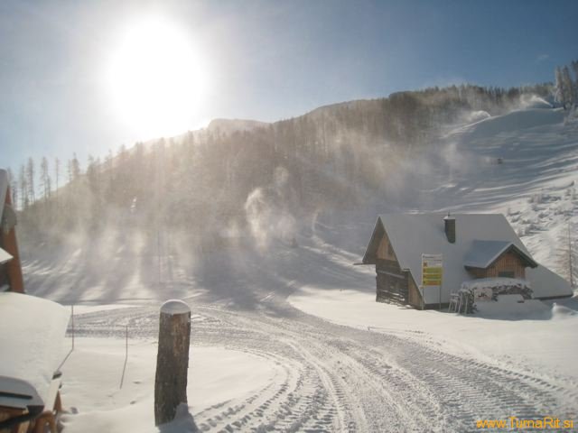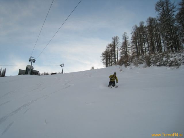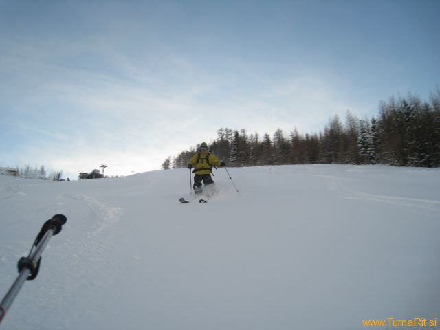 Danes pa sem bil sam. V dolino sem smučal celo pot po cesti, saj je snega premalo. Upajmo, da ga jutrišnja porcija prinese vsaj ene 30. Drugače pa vsi topi na smučišču bruhajo na polno. Drugi vikend smučišče zalaufa.