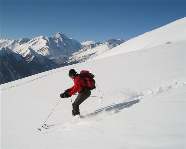 Samotna smučarija po celcu v idealnem, brezveternem vremenu, s pogledom na Glockner.