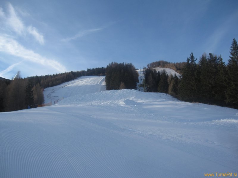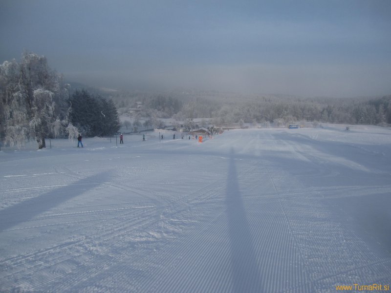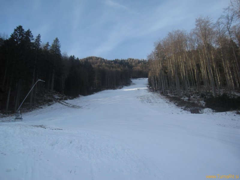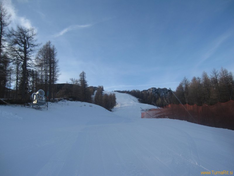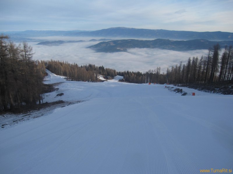 Tudi tokrat sosedi na severni strani Pece niso razočarali, zrihtali so dovolj umetnega snega in odprli progo v dolino (za smučarje uradno odprejo jutri), da bomo lahko med prazniki nabirali višince in pokurli malo prazničnih dobrot.