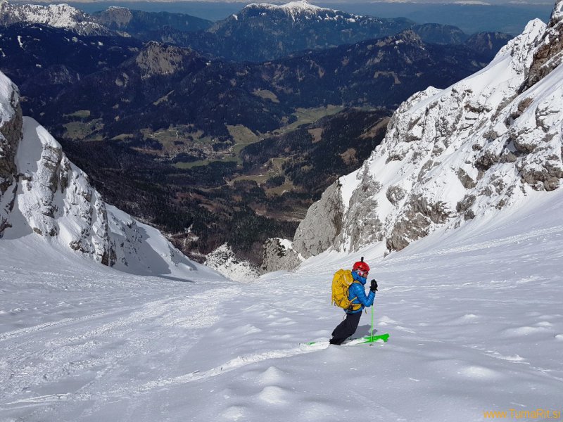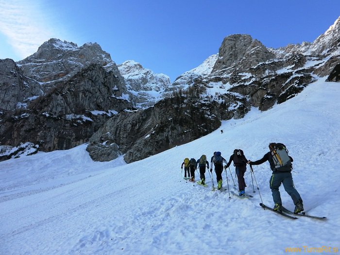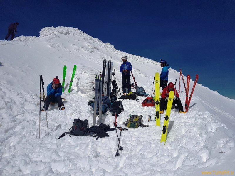 Vzpon po trdem, mestoma ledenem terenu. Na vrhu smo čakali dobro uro in pol, vmes pa je sonček delal za nas. Sledilo je vijuganje s 1500 metri višinske razlike do doline v dokaj spremenljivih razmerah.