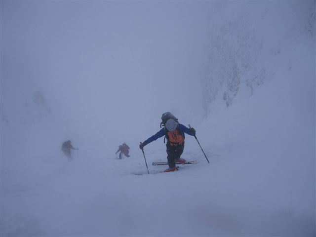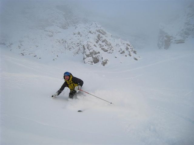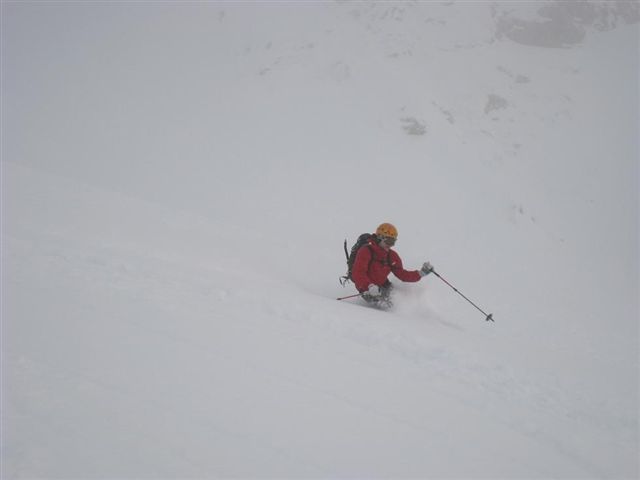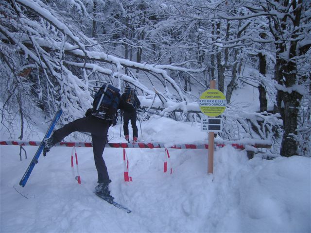 Iz vasice Sele smo se zaradi podrtega drevja komaj prebili do Koče pod Košuto (1289m). Naprej je šlo lažje, le vidljivost je bila zaradi sneženja bolj klavrna. Na Cjajnikovi škrbini (1980m) pa smo uzrli tudi nekaj modrega neba. Smuka je bila odlična – veseli puhec nam je dobesedno šprical za vrat (do 50 cm novega snega).