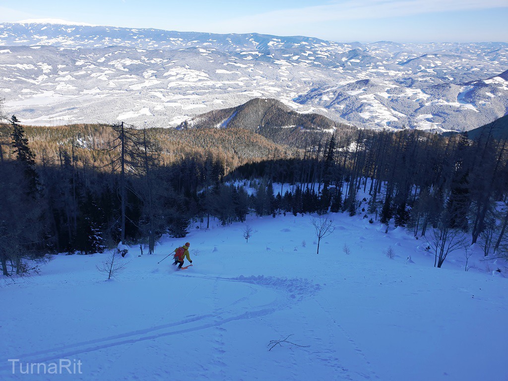 Z viharne Kordeževe glave smo hitro odsmučali v Grebenski žlih in čez Rišperk v Mežico. Skupaj cca. 18 km in 1700 v.m.